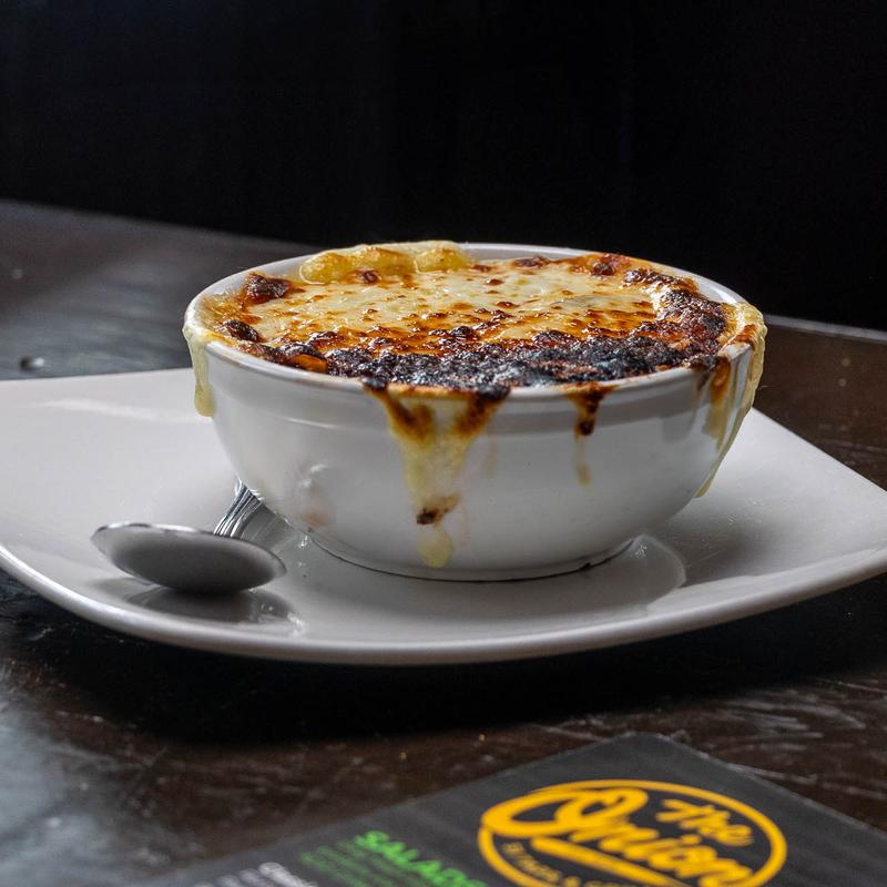 $6.00 | $10.00 • Reduced brandy deglazed beef stock and caramelized onion. Topped and baked with brown three cheese baguette.