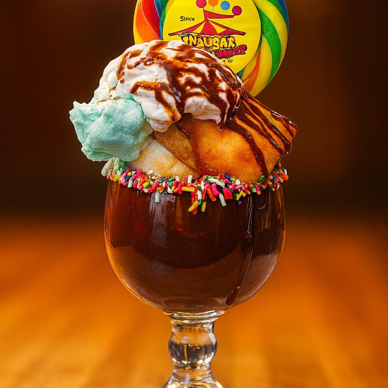 Massive world-famous giant hot fudge sundae with house-made confetti cake, cotton candy and a lollipop | Free on your birthday