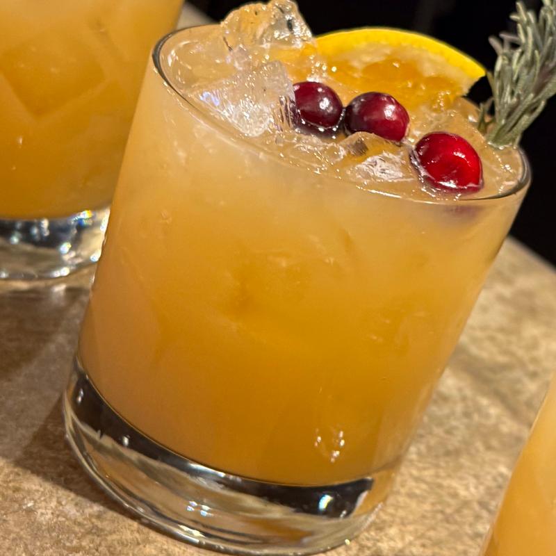 Patron Silver Tequila & Cointreau shaken with fresh lime & spicy hot honey garnished with fresh cranberries, orange and rosemary